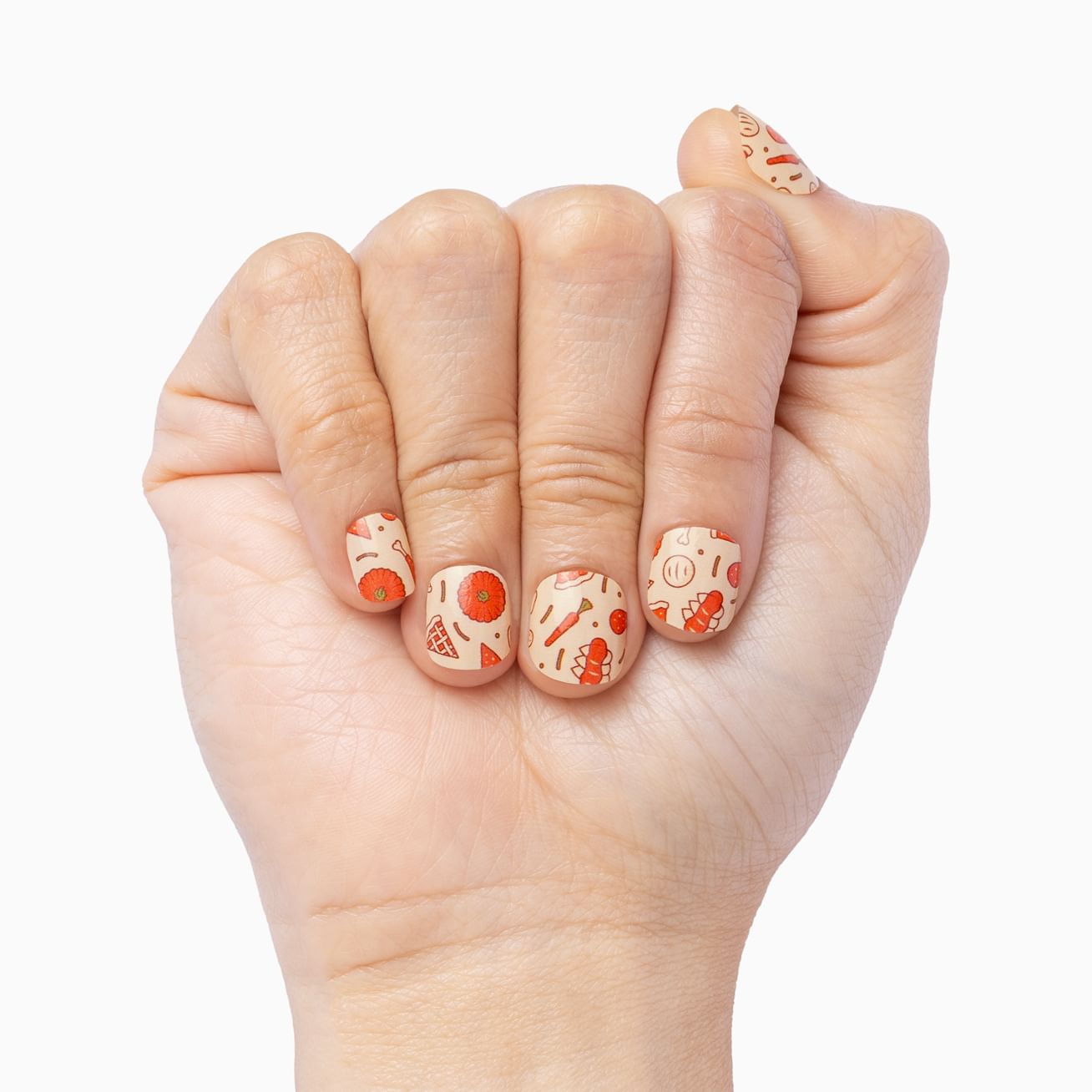 Perky Turkey gives you plenty to be thankful for with its cute turkey wearing a pilgrim hat. This wrap set with milk chocolate and mocha browns dotted with orange, white, and gray is sure to delight throughout all your Thanksgiving turkey tomfoolery. Add a swipe of top coat to protect this adorable manicure.