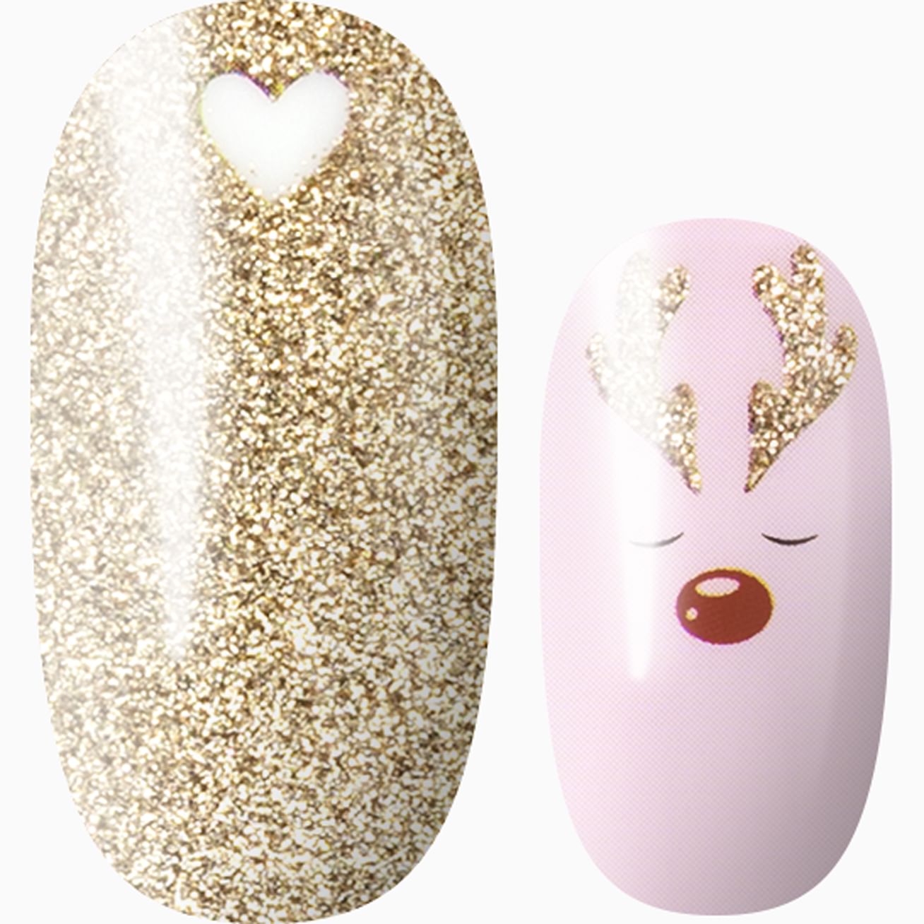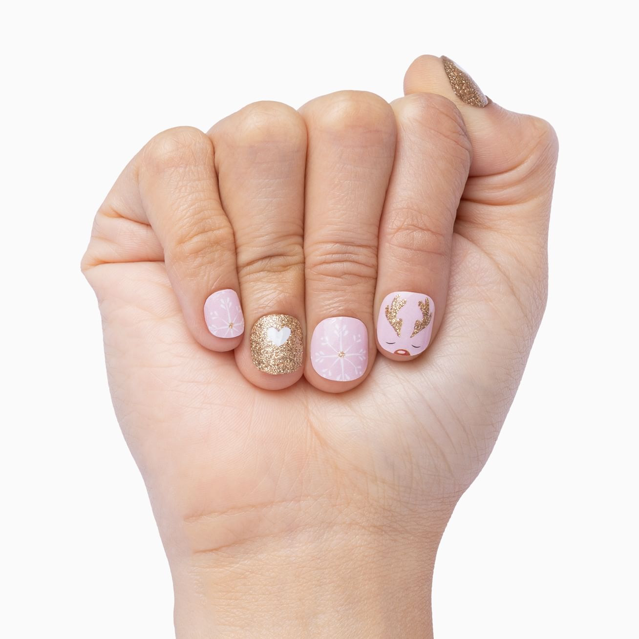Let Rudolph lead the way to this whimsical wrap set that includes golden sparkles with white hearts at the cuticle, a sleepy reindeer with golden antlers and a red nose set against a pale pink background, and glitter-kissed snowflakes set against that same rosy pink. You must be on the nice list - these nail wraps apply in moments and can hold up to gift wrapping (and unwrapping) and all the holiday activities that keep you jingling all the way!