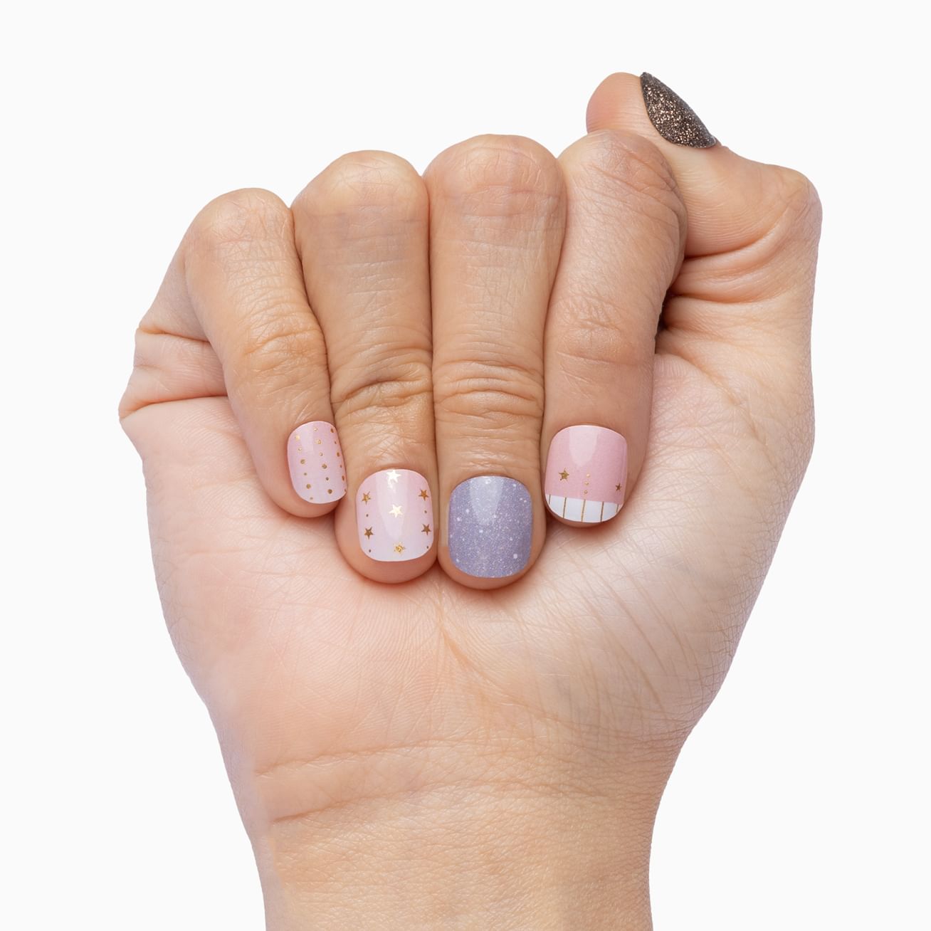 Look at the Stars (look how they) Shine For You. Don't mind my cold wordplay. This nail wrap set features six different designs with gold glitter against a black background, silver glitter against a purple-gray background, and a mix of pink and white French tips and ombres dotted with dainty gold glittering stars. Don't let tears stream down your face, it would be such a shame for this manicure to part early so top it off with a layer of top coat.