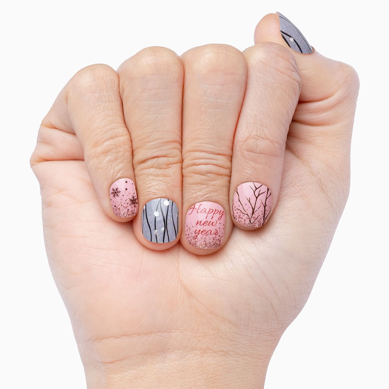 Countdown to the New Year in style with glossy grays streaming with holographic details, glossy pink wraps beaming "Happy New Year" in red, snowflakes and trees in black, topped with an ombré effect pink glitter. Keep the party going by adding a layer of top coat.