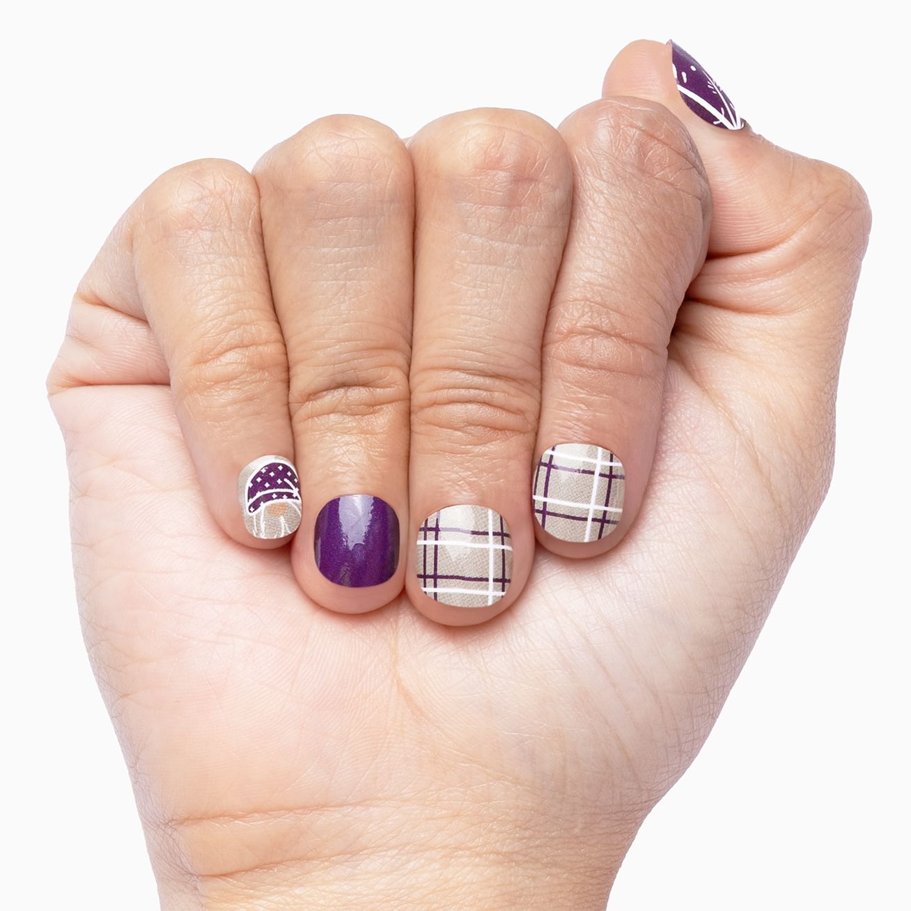 Enchanted Kingdom will bewitch you with its soft, gray wizardy-looking gnome clad in deep purple, starry attire. Additional designs in this set include a solid glossy purple, a purple and white plaid set against a gray background, and a white snowflake and dots against deep purple. Keep this magical mani going strong by adding a layer of top coat.