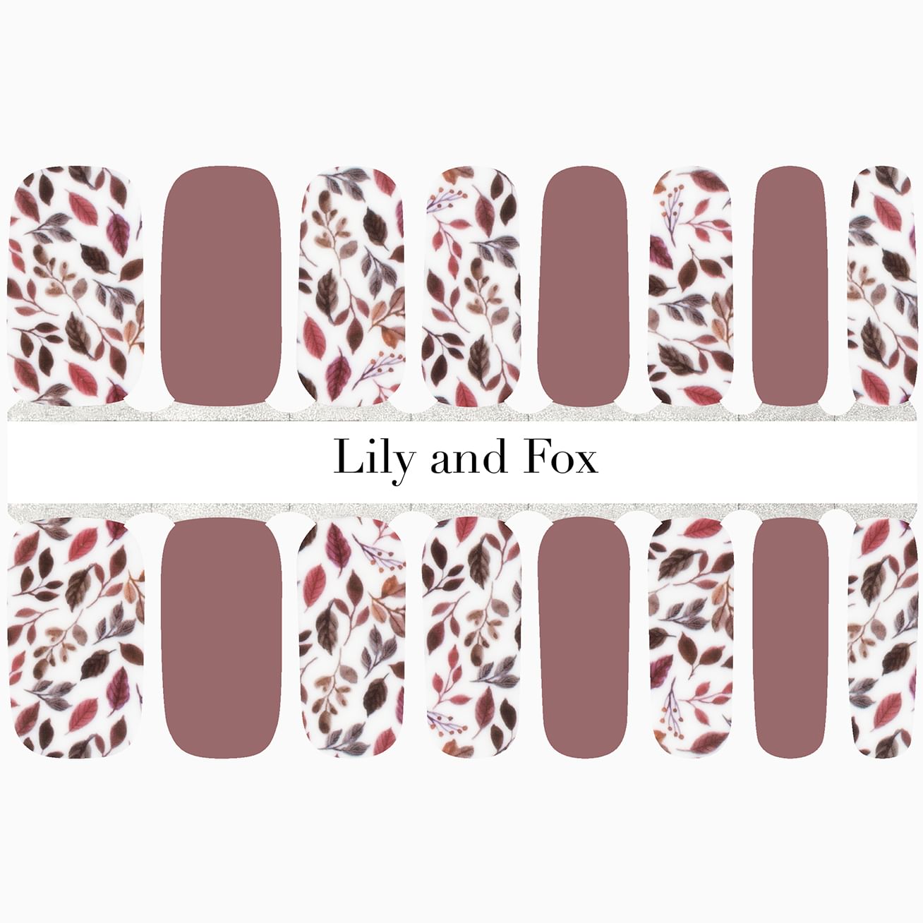 Kiss the Breeze is a romantic, windswept nail wrap set featuring soft purple, gray, and berry leaves against a white, glossy background with smokey-purple solids. Orange you glad you have options in leaf peeping color palettes?