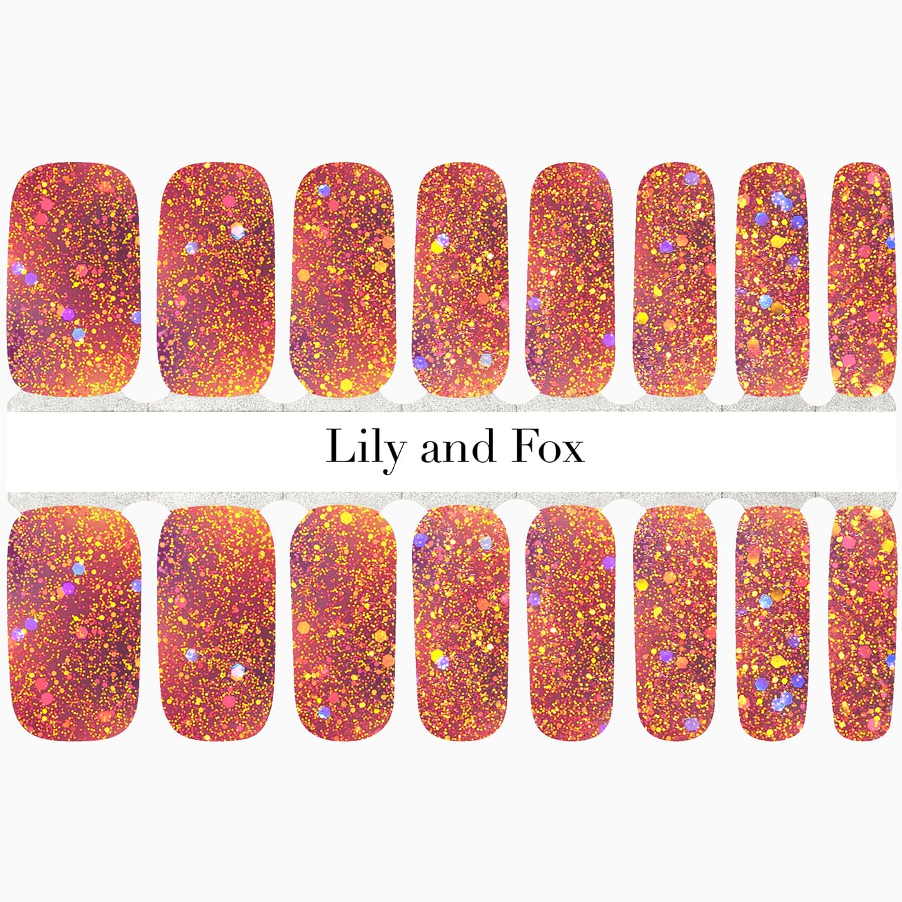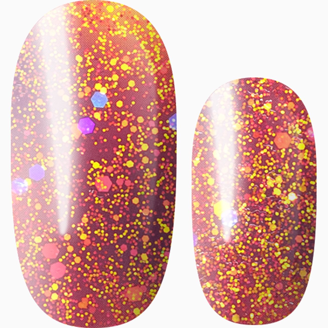 This look is 🔥with warm oranges, reds, and yellows with all sizes of gold, orange, and iridescent purple glitter to bring out your inner goddess, you foxy phoenix! Be prepared to be mesmerized by the magic on your fingertips in a manicure you can apply in minutes and gaze at longingly for weeks.
