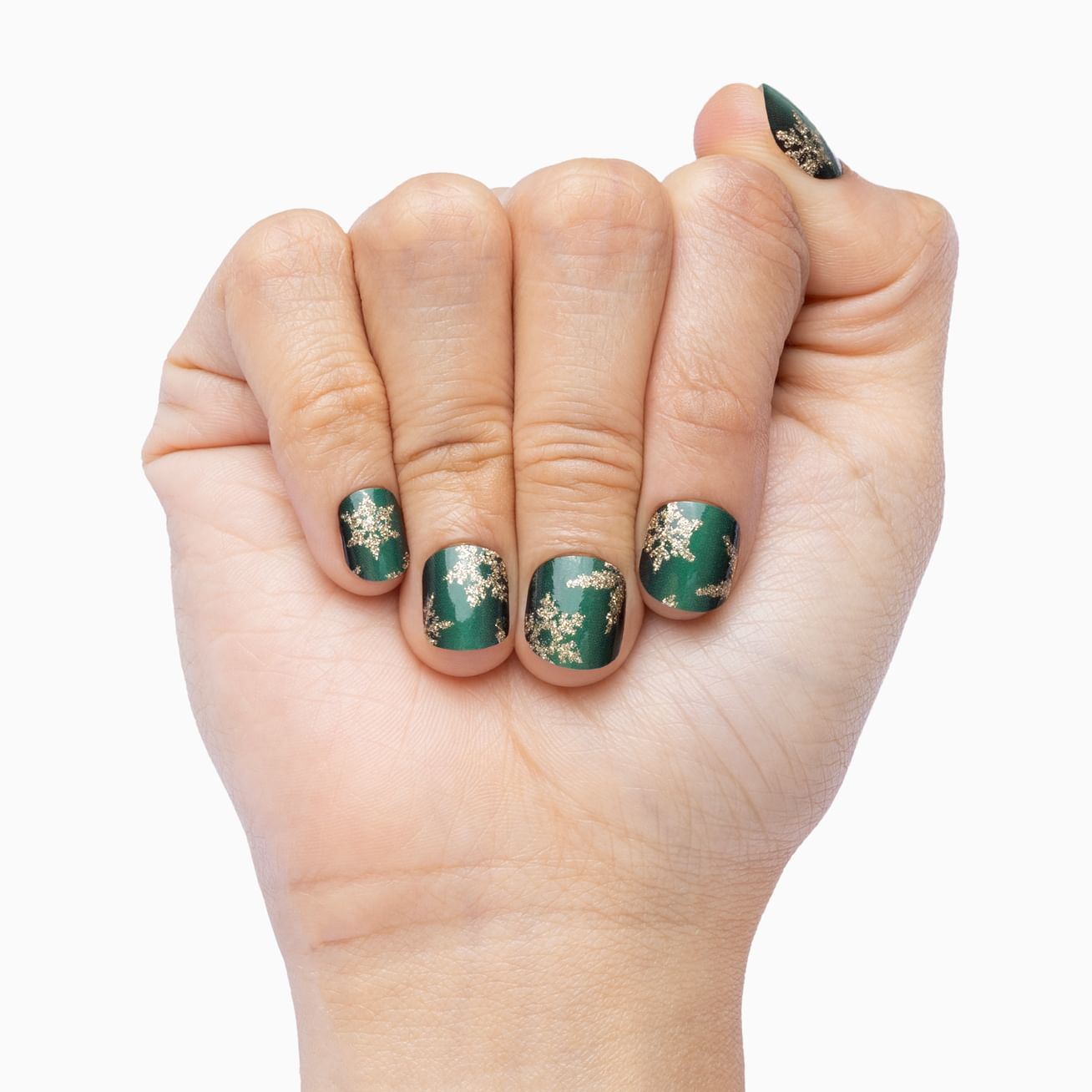 Gilded Snowfall features glittery gold snowflakes against a black and green centered ombre for a dramatic wintry look. Perfect for any length of nails, this manicure can be applied in minutes for weeks of wear.