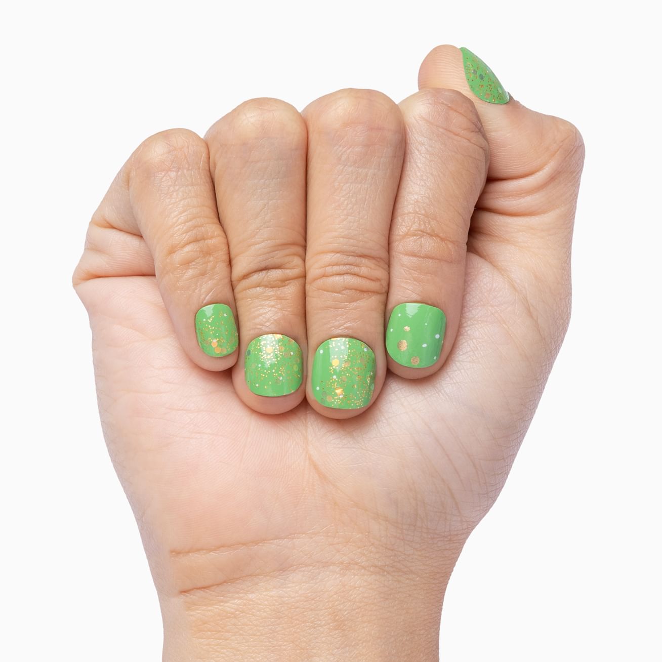 This look is 🔥with warm oranges, reds, and yellows with all sizes of gold, orange, and iridescent purple glitter to bring out your inner goddess, you foxy phoenix! Be prepared to be mesmerized by the magic on your fingertips in a manicure you can apply in minutes and gaze at longingly for weeks.