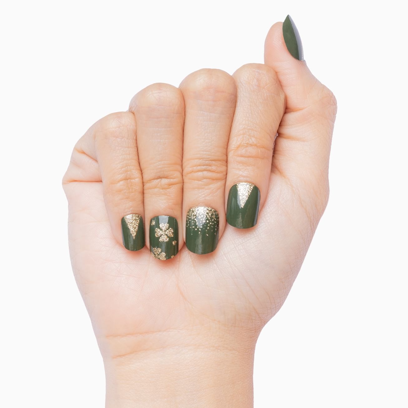 Blow Me Away combines gold glitter accents with windswept maple leaves, boughs, and branches for a manicure that says, "it's fall, y'all." With the design right at the cuticle, these are picture-perfect on short nails and give glam leaf peeps on longer fingertips. You'll be blown away by how quickly and easily these can be applied.