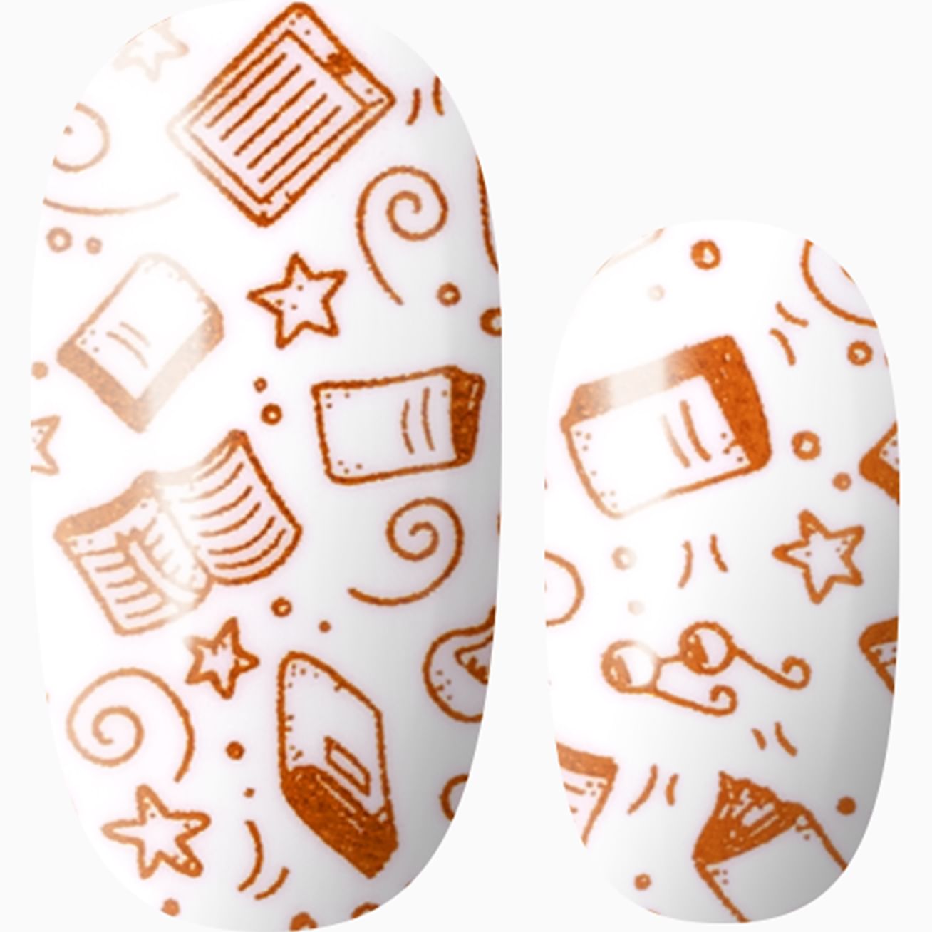 The only thing that can get between you and one more chapter in your book may be One More Chapter on your fingernails! Dare to be distracted by the gorgeous copper metallic pattern with books, eReaders, stars, swirls, and spectacles that will bemuse your inner bibliophile. Don't worry about smearing wet polish on your pages or chipping a nail while tearing into your next page turner with these easy-to-apply, long-lasting nail wraps.