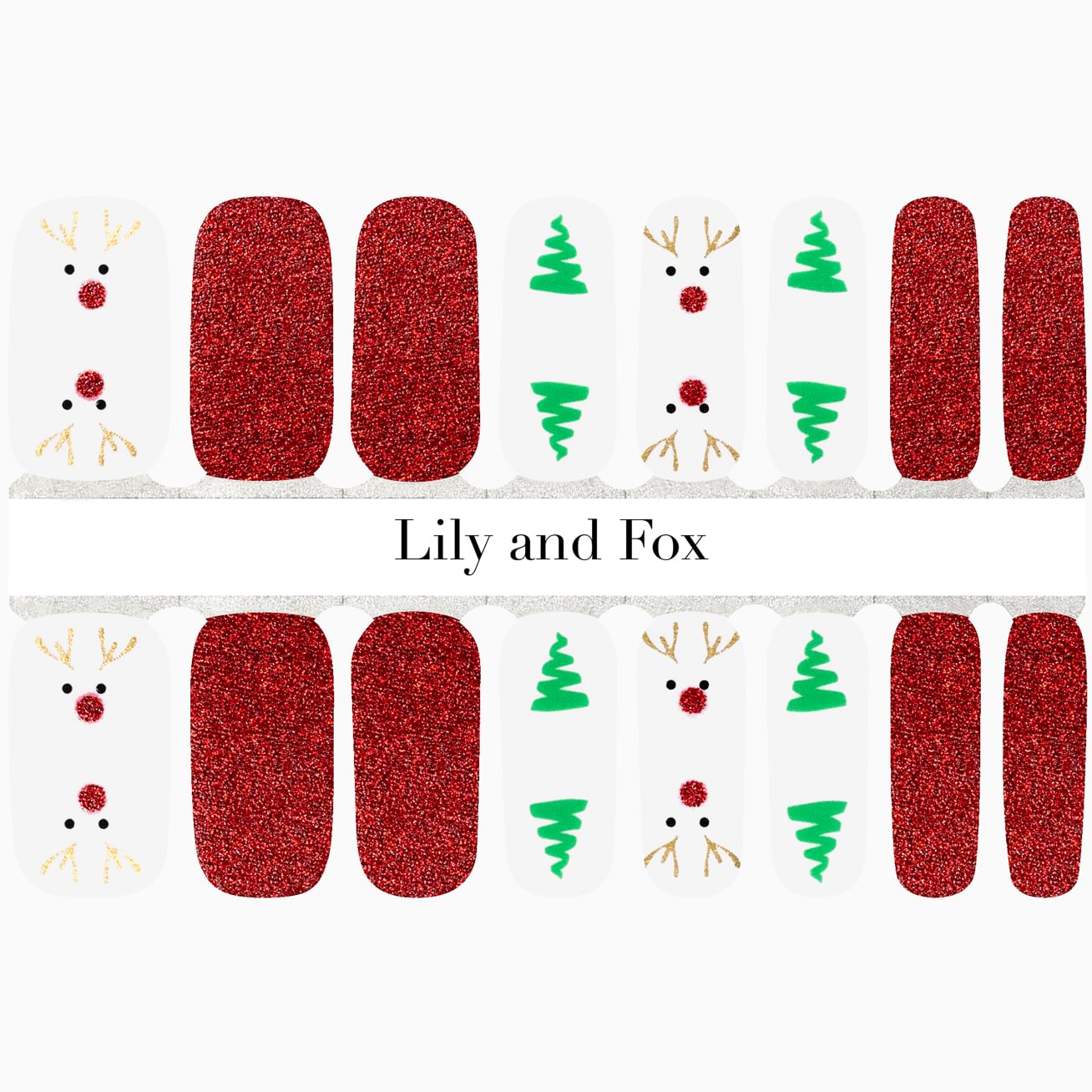 You can rule the holiday season with this beautiful mixed manicure set featuring deep, glossy reds topped with gold glitter snowflakes, a design featuring a hint of a white snowflake at the cuticle, full-glam gold glitter, and an accent wrap of reindeer antlers with a crown of roses set against a white background. Yes, queen! Extend your reign by adding a layer of top coat.