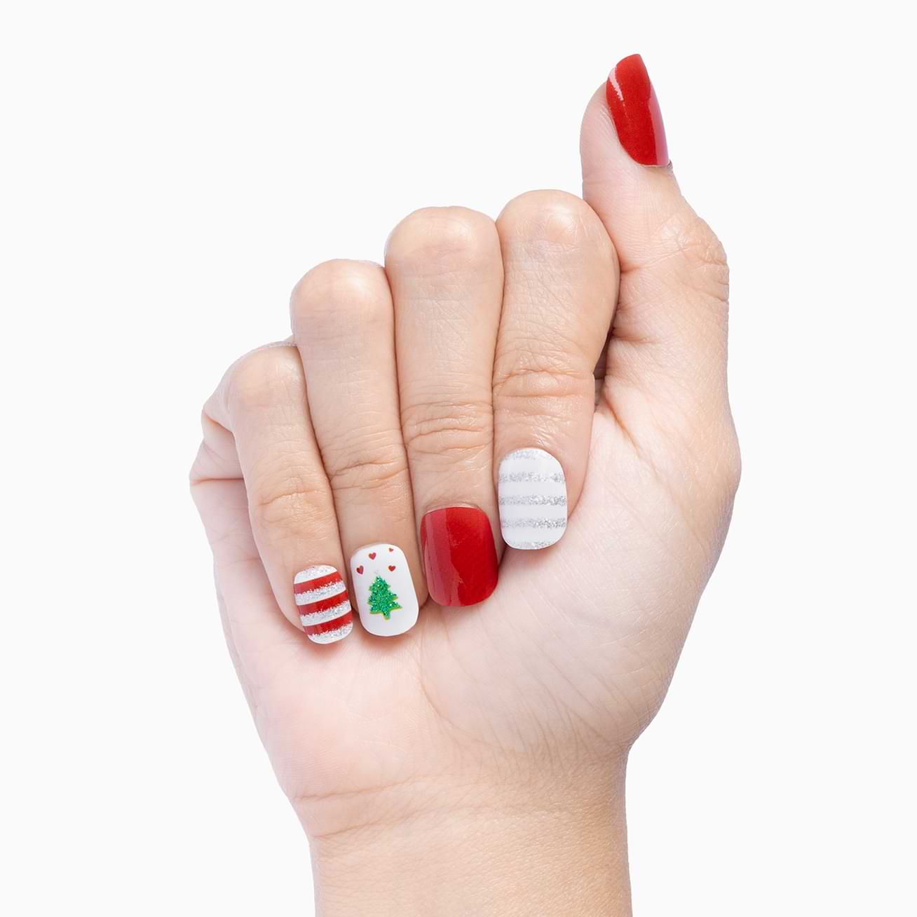 With so many red nail moments for the holiday season, it's sometimes hard to choose. With Wrapped in Red, you get all the season's best looks with red glitter, snowflakes on French tips, and candy-cane stripes. Pop this set on in minutes for a manicure that stands up to gift wrapping (or unwrapping) for weeks!