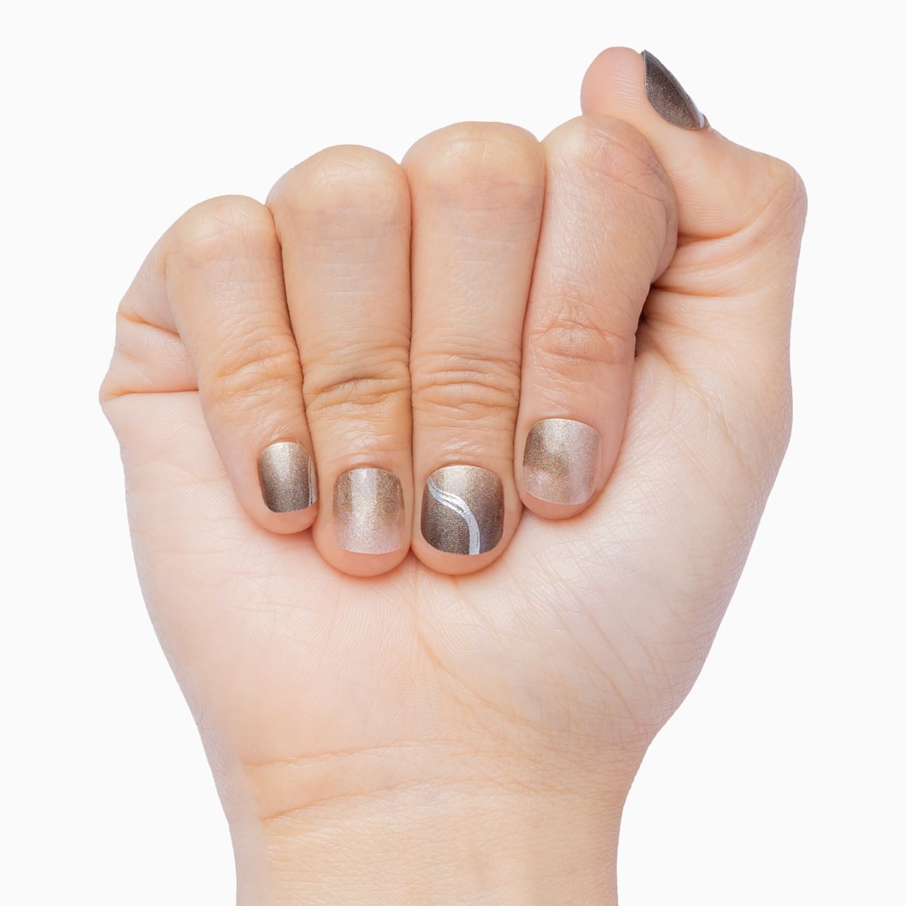 Sweet Innocence features neutral pearlescent ombre and marbled swirls topped with delicate silver metallic streams. Keep this sweet look safe with a layer of top coat.