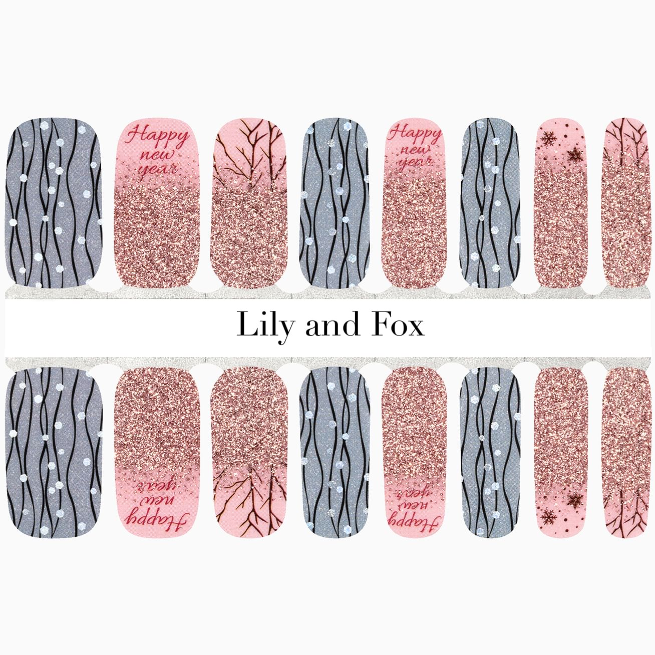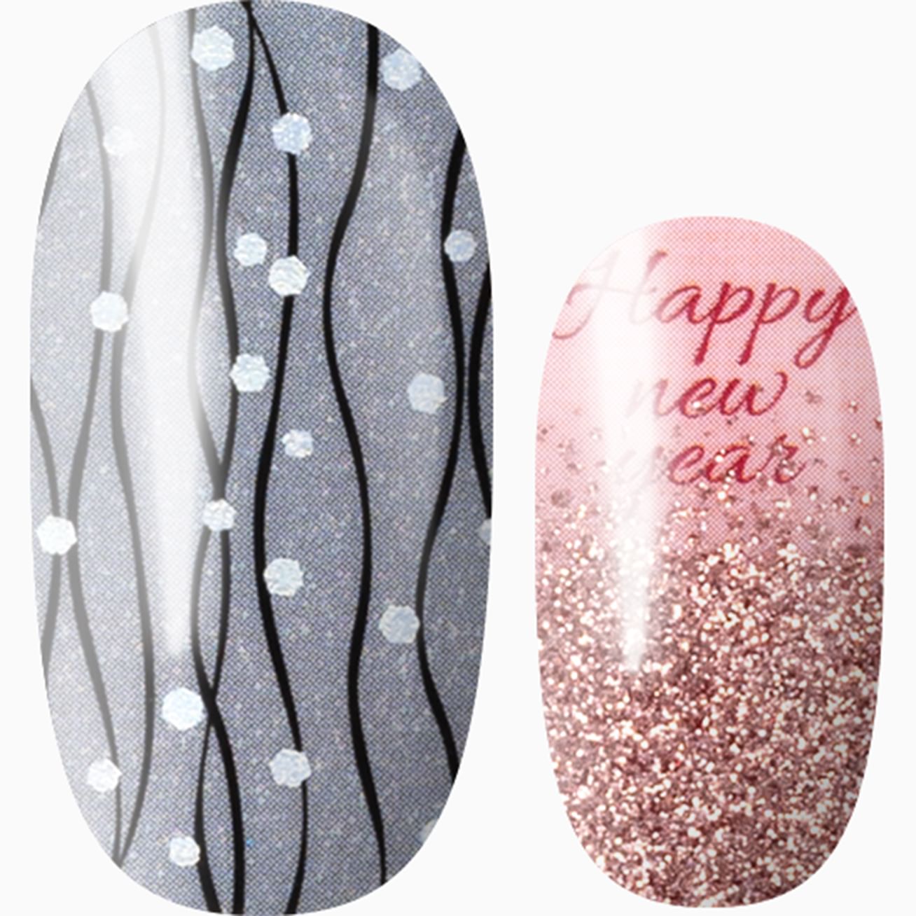 Countdown to the New Year in style with glossy grays streaming with holographic details, glossy pink wraps beaming "Happy New Year" in red, snowflakes and trees in black, topped with an ombré effect pink glitter. Keep the party going by adding a layer of top coat.