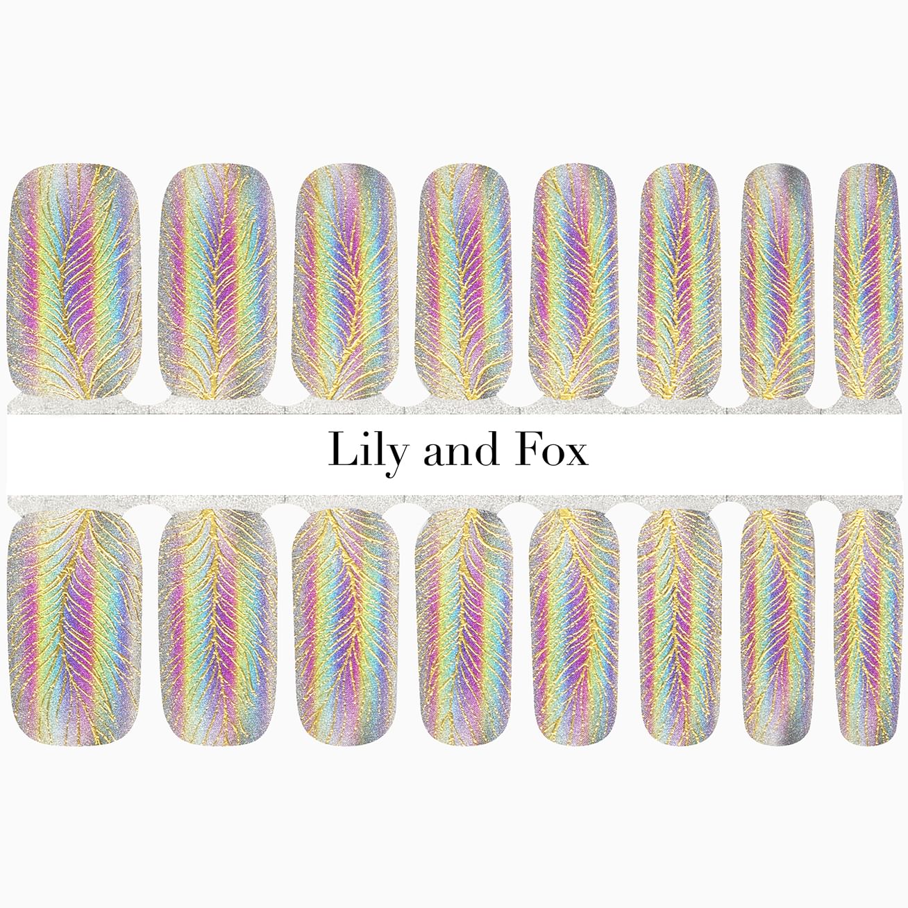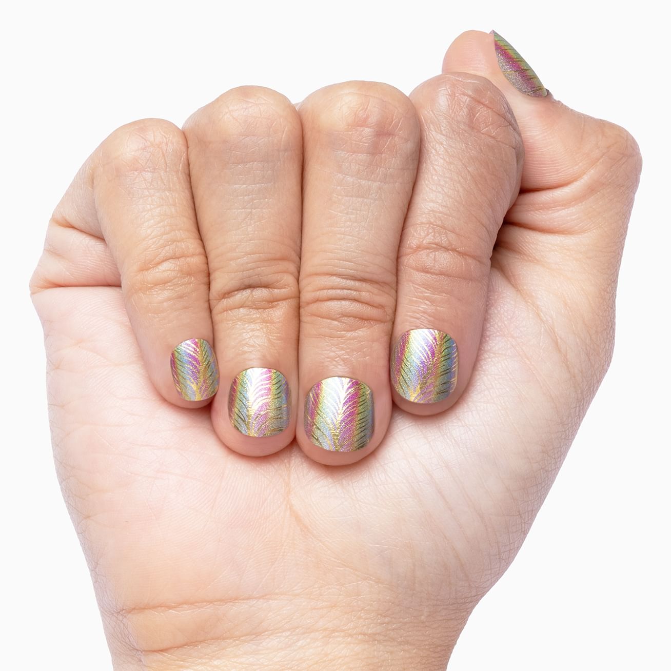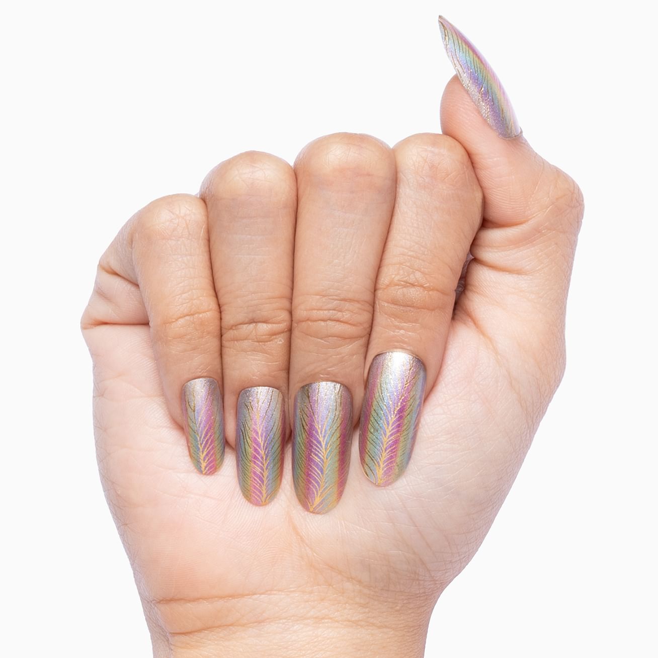 This look is 🔥with warm oranges, reds, and yellows with all sizes of gold, orange, and iridescent purple glitter to bring out your inner goddess, you foxy phoenix! Be prepared to be mesmerized by the magic on your fingertips in a manicure you can apply in minutes and gaze at longingly for weeks.