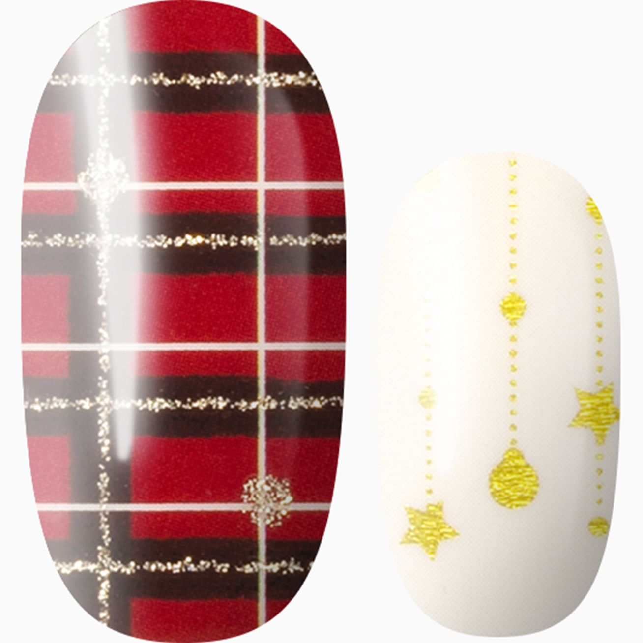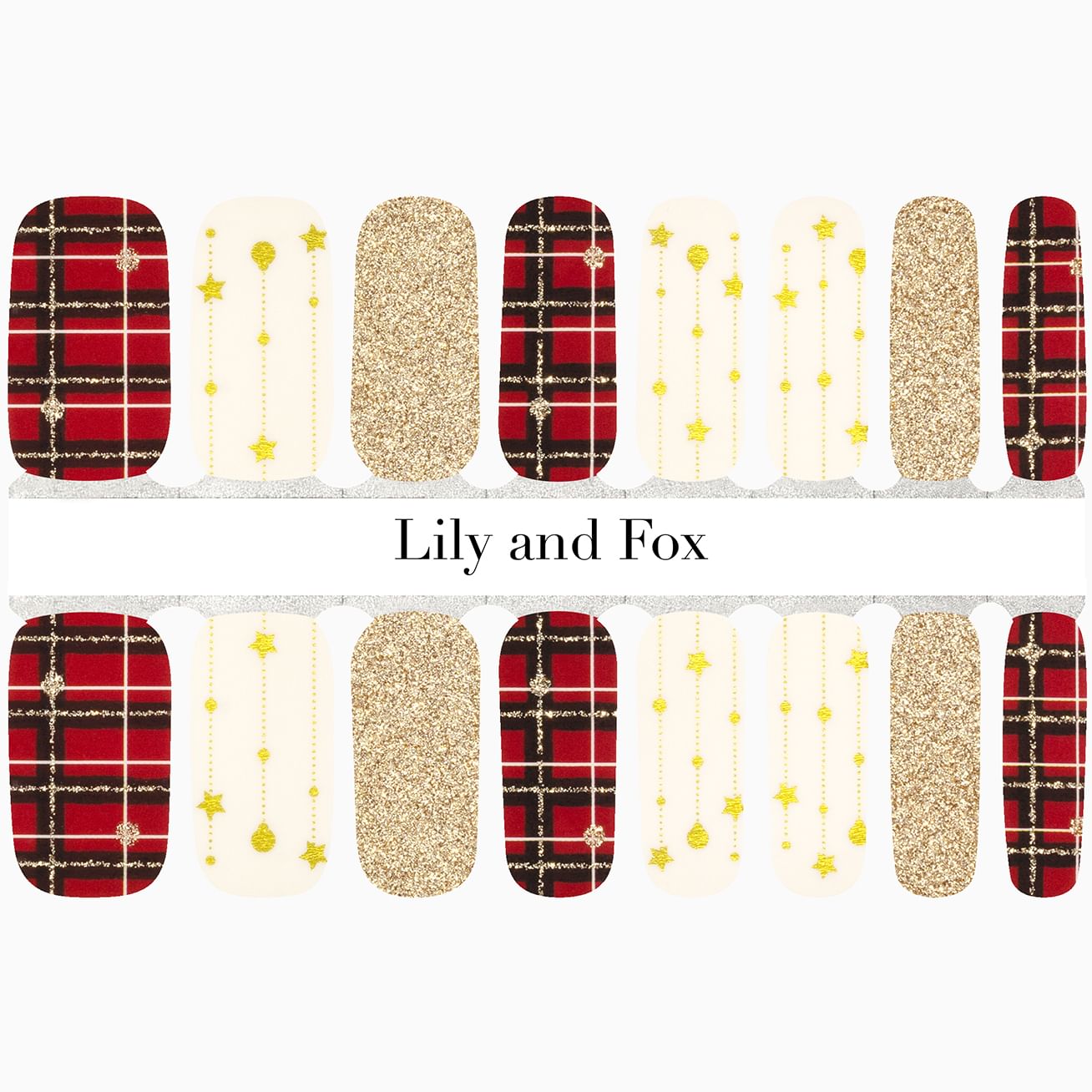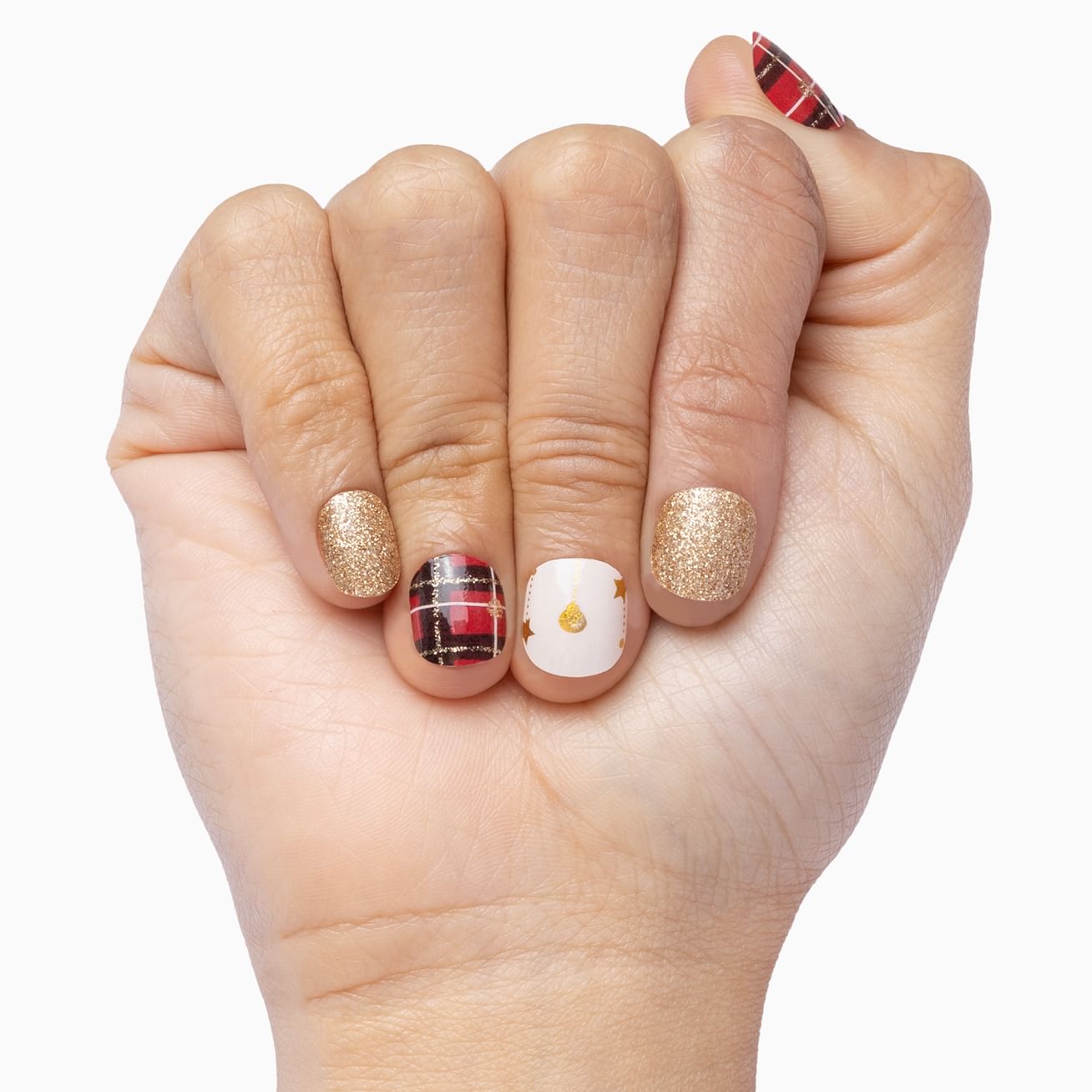 You'll take a shining to this elegant holiday set featuring red, black, and white plaid with golden accents, metallic gold ornaments dangling from your fingertips, and solid gold glitter wraps. Shine For Me can be applied in minutes and sparkle for weeks!