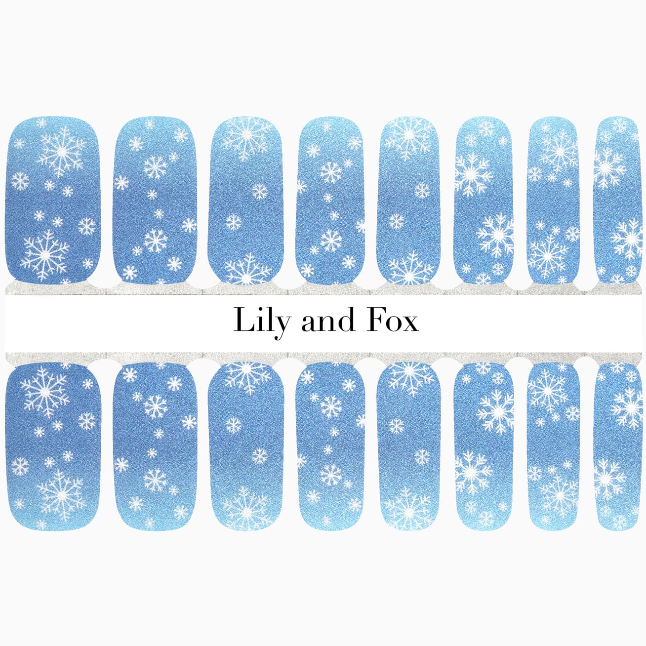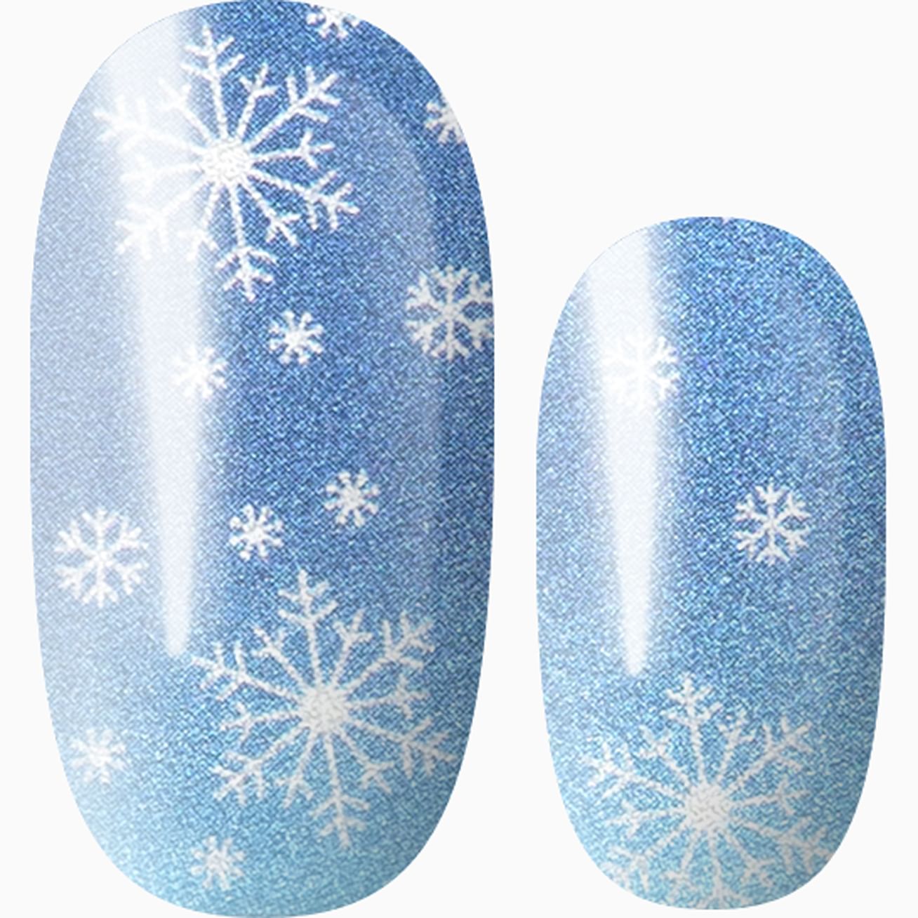 Snow Doubt About It! features delicate snowflakes fluttering across a subtle light blue to medium blue ombre background. The pearlescent finish looks like pristine snowfall under wintry light. Pro tip: when you're ready to let it go, you can "melt" this manicure off your fingernails with warm coconut oil for an easy, hydrating, all-natural removal.