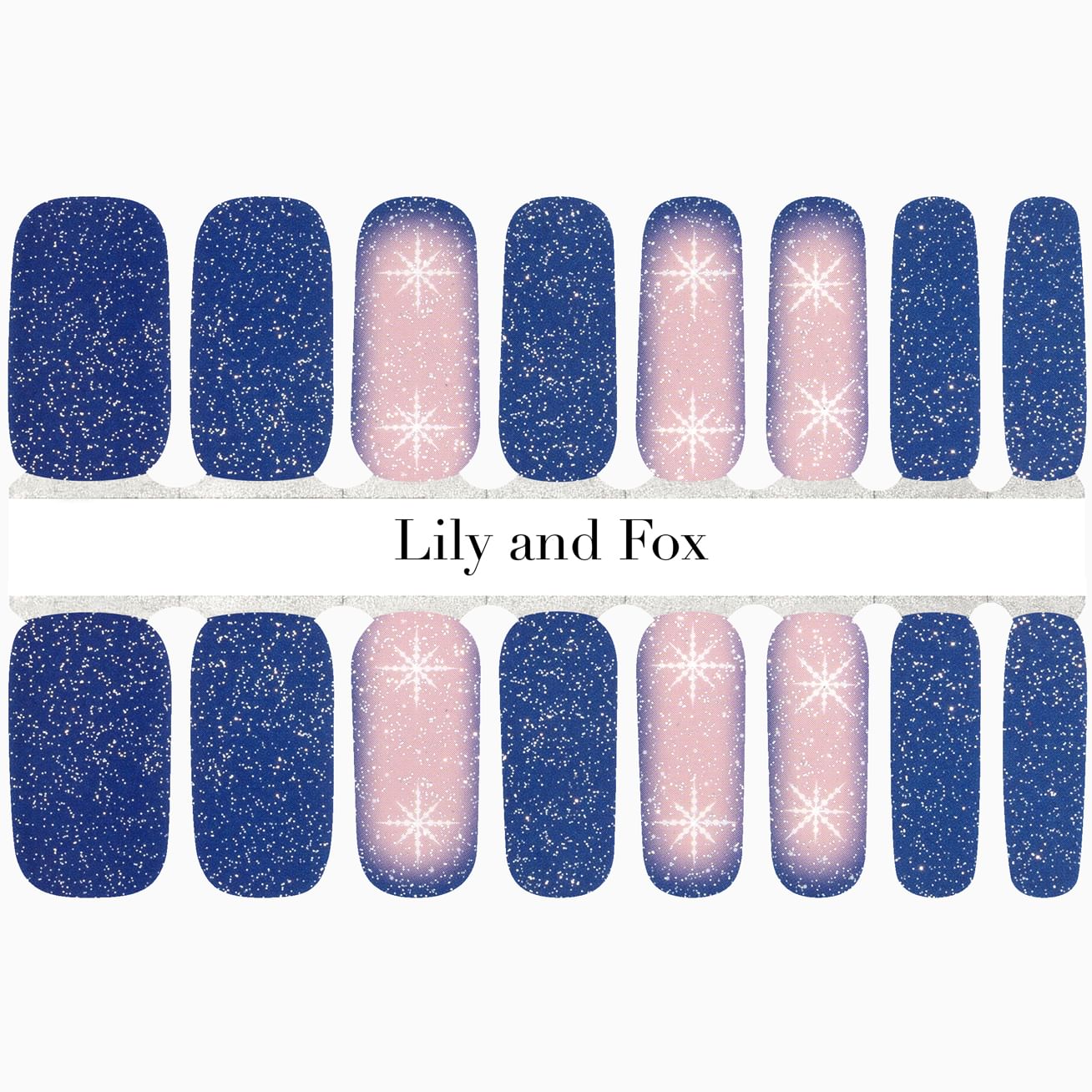 Let your fingertips pirouette into a winter dream with Sugarplum Fairy. Soft, silvery glitter is sprinkled over dreamy sold blue is paired with a delicate ombré design that kisses the cuticle with just a whisper of blue that fades into ballet-slipper pink with dainty white snowflakes. These wraps feel like a fairytale dancing across your nails - graceful, frosty, and full of holiday magic.